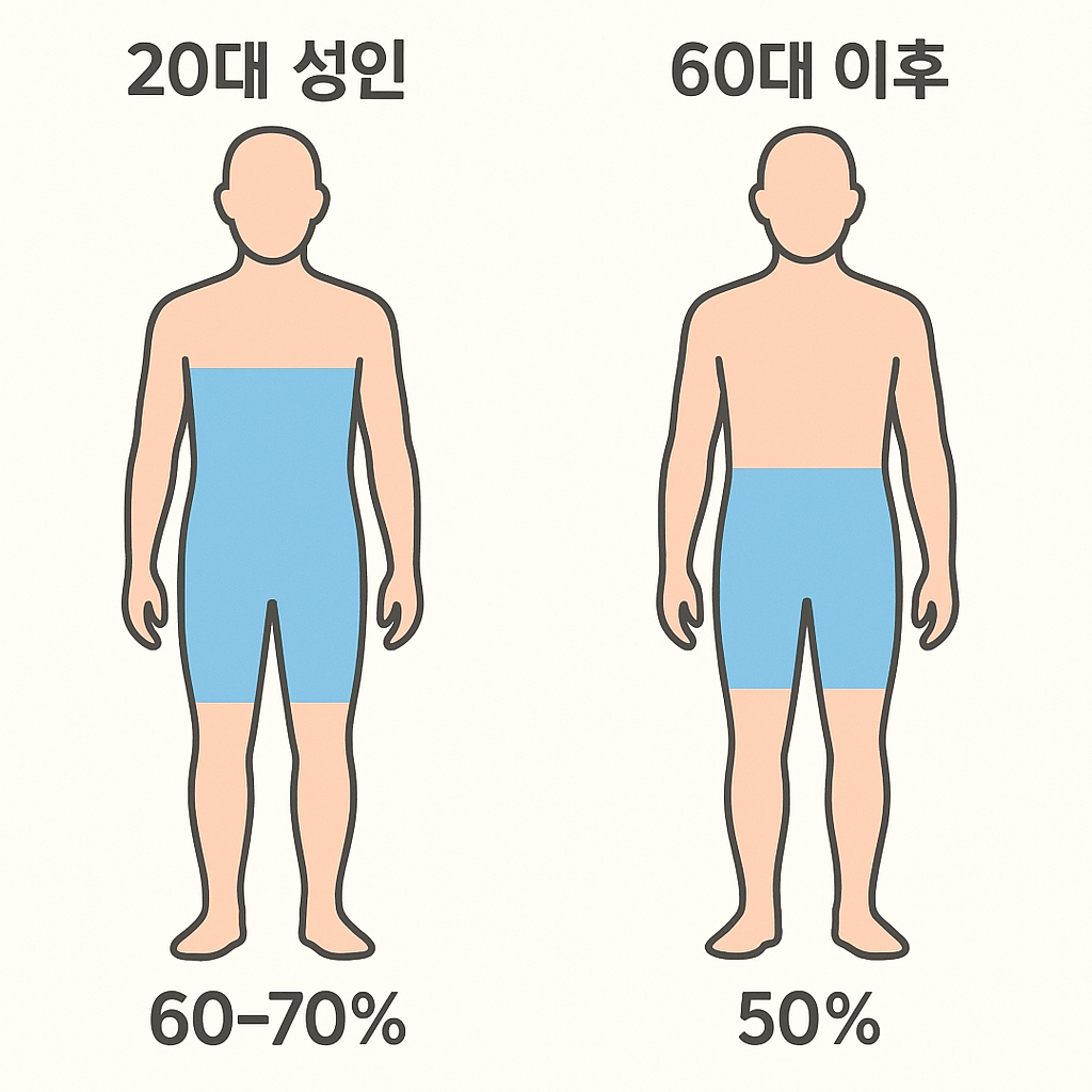 그러나 나이가 들수록 이 비율은 서서히 낮아진다. 20대 성인의 체내 수분은 전체 체중의 약 60~70%를 차지하지만, 60대 이후에는 50%대로 떨어진다.